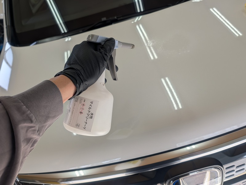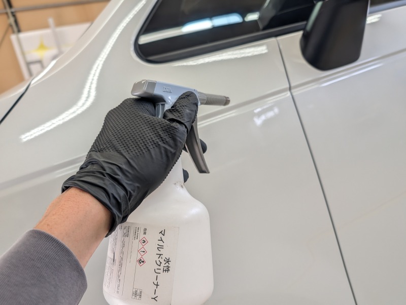 水性タイプの脱脂洗浄剤を使い、コーティング前に塗装面のクリーニングを行います。