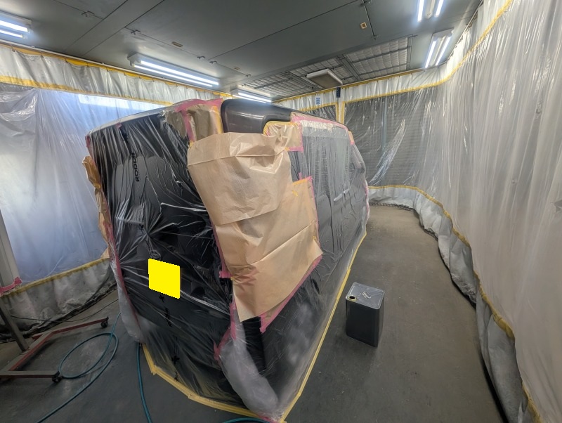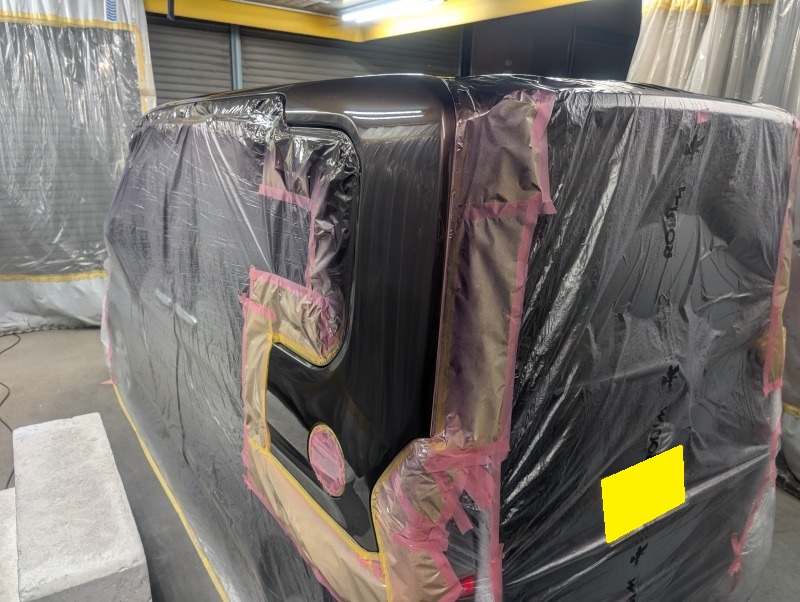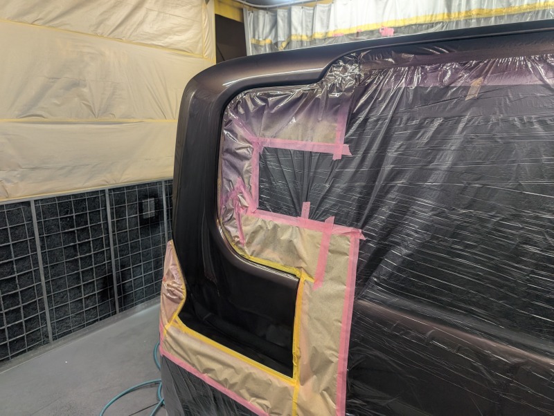 画像にはございませんが、削り落とした塗膜の上にプライマーサフェーサーという下地塗装を行い、それからベースコート(ブラウン系色)クリヤーコート(透明の塗装)を行いました。