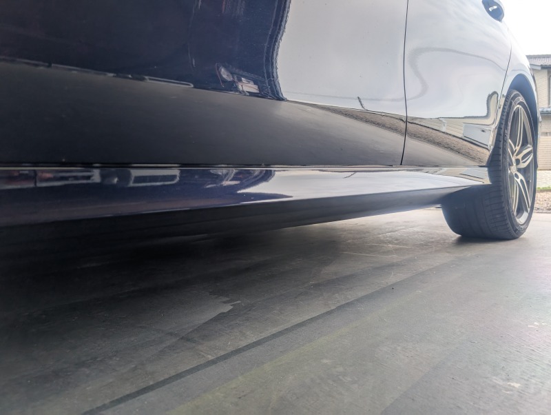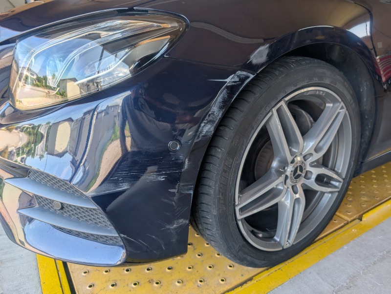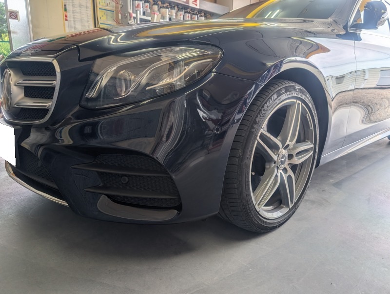 Mercedes-Benz E220dステーションワゴンのフロントバンパー左側、左フロントフェンダー、左サイドステップカバーの修理塗装のご依頼です。