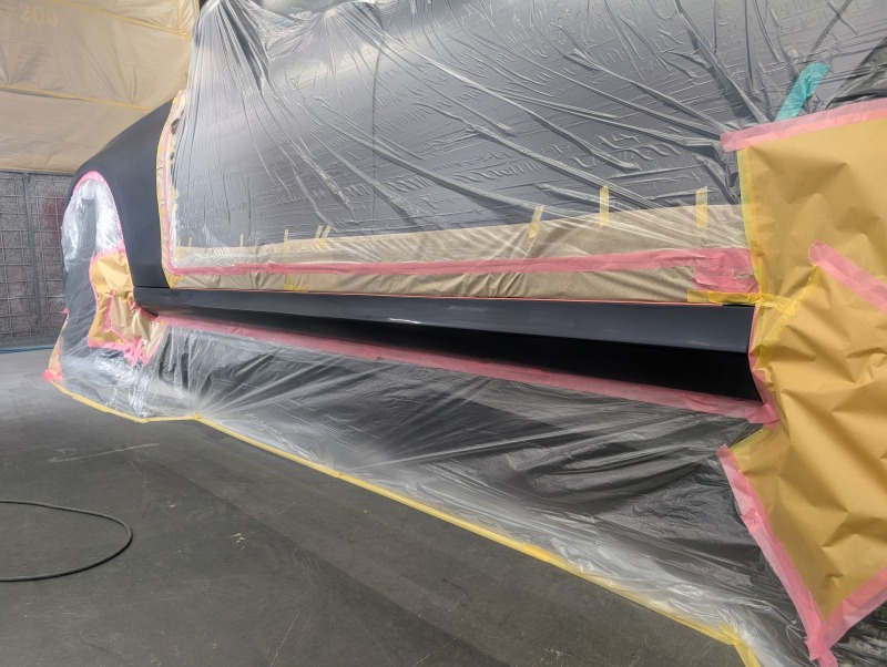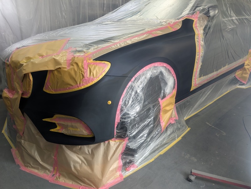 写真だと分かりづらいですが、黒い箇所が修理した範囲、マスキングした箇所が塗装範囲です。